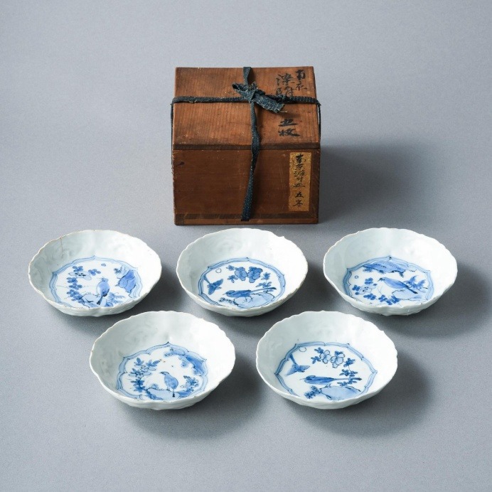 明末清初 青花 花鳥文 小皿 五客揃 箱付 染付